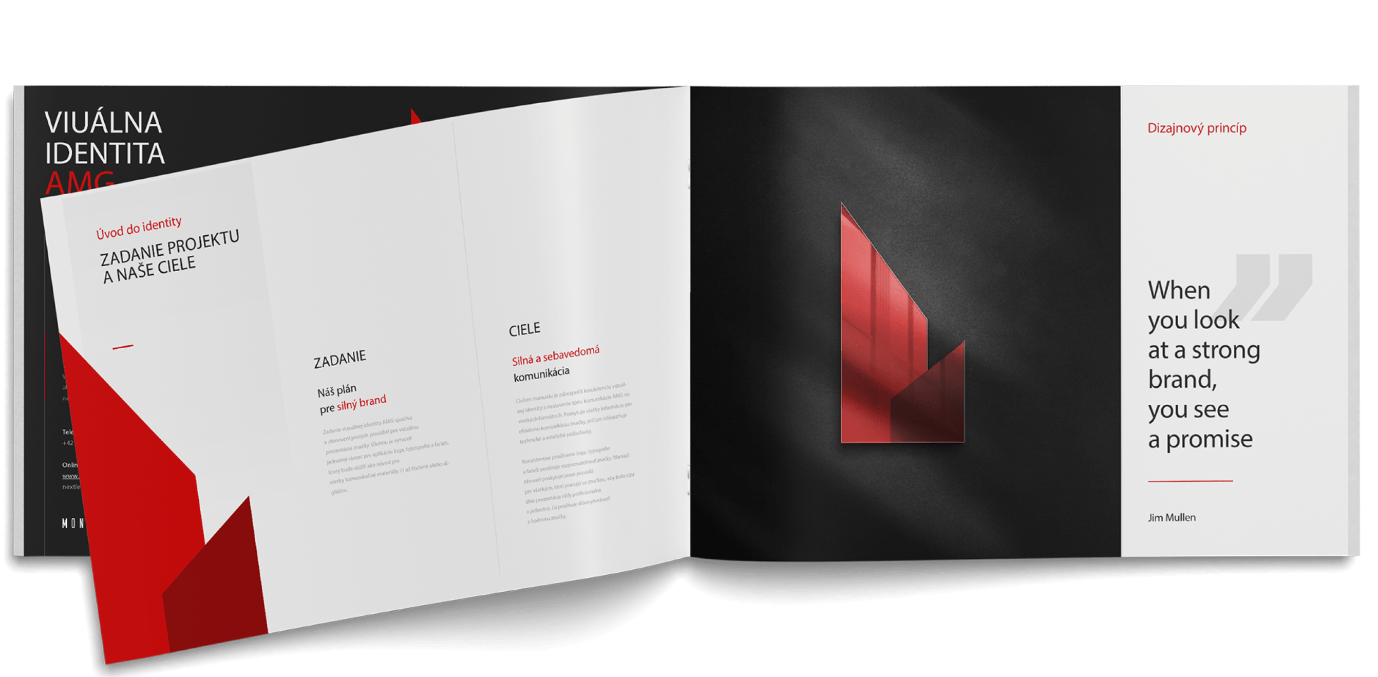 Pro společnost AMG, která se zabývá vybavením a zabezpečením objektů, jsme vytvořili vizuální identitu v podobě funkčního brandbooku, který definuje hlavní vizuální pravidla značky, díky nimž bude značka na trhu dlouhodobě rozpoznatelná a konzistentní a mezi stále rostoucí konkurencí nezaměnitelná.