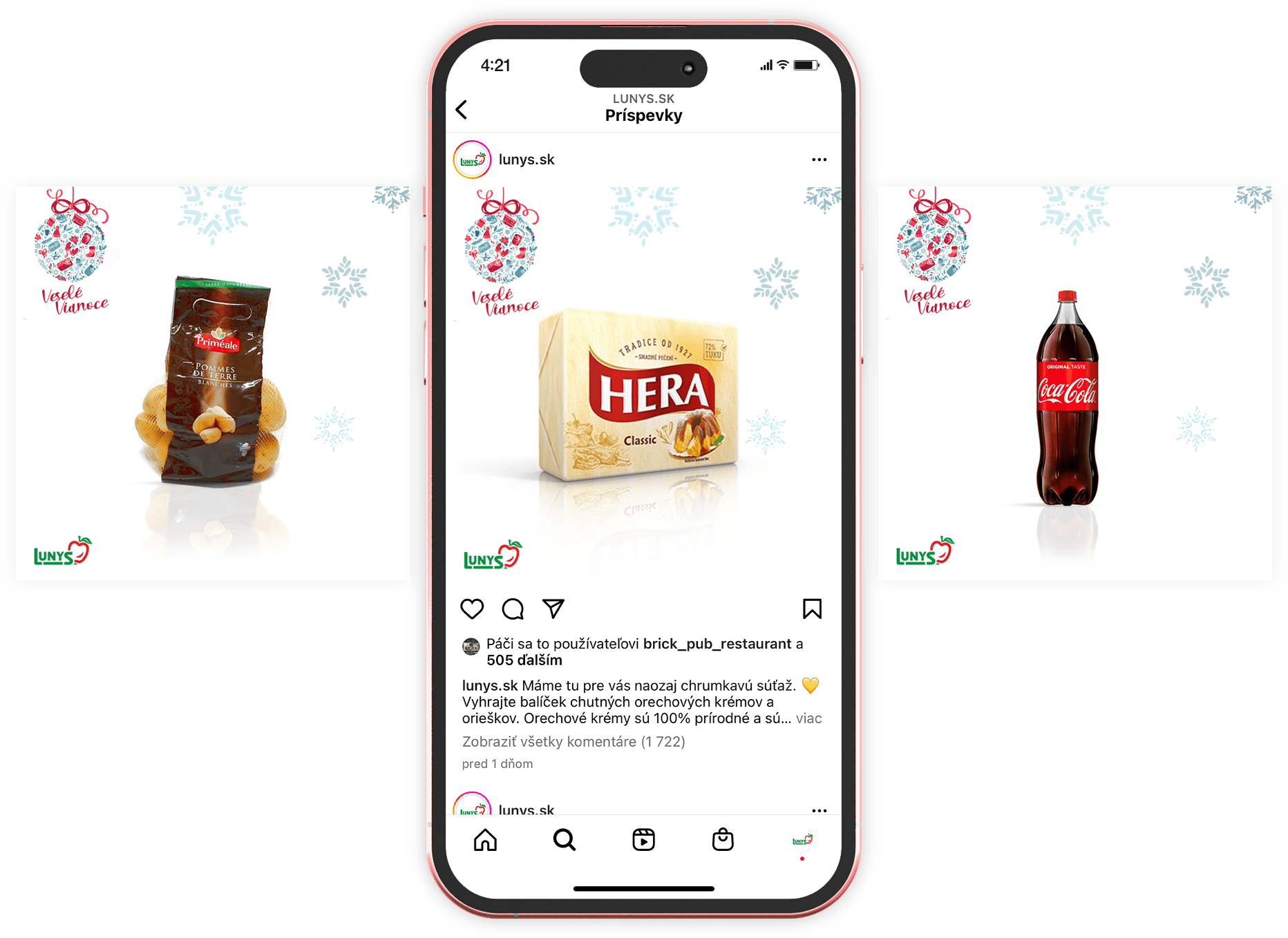 V carouselech navržených pro sociální síť Instagram jsme použili rámec spojený s tradičními vánočními vzory. Vizuální dojem jsme umocnili zrcadlovým efektem produktů.