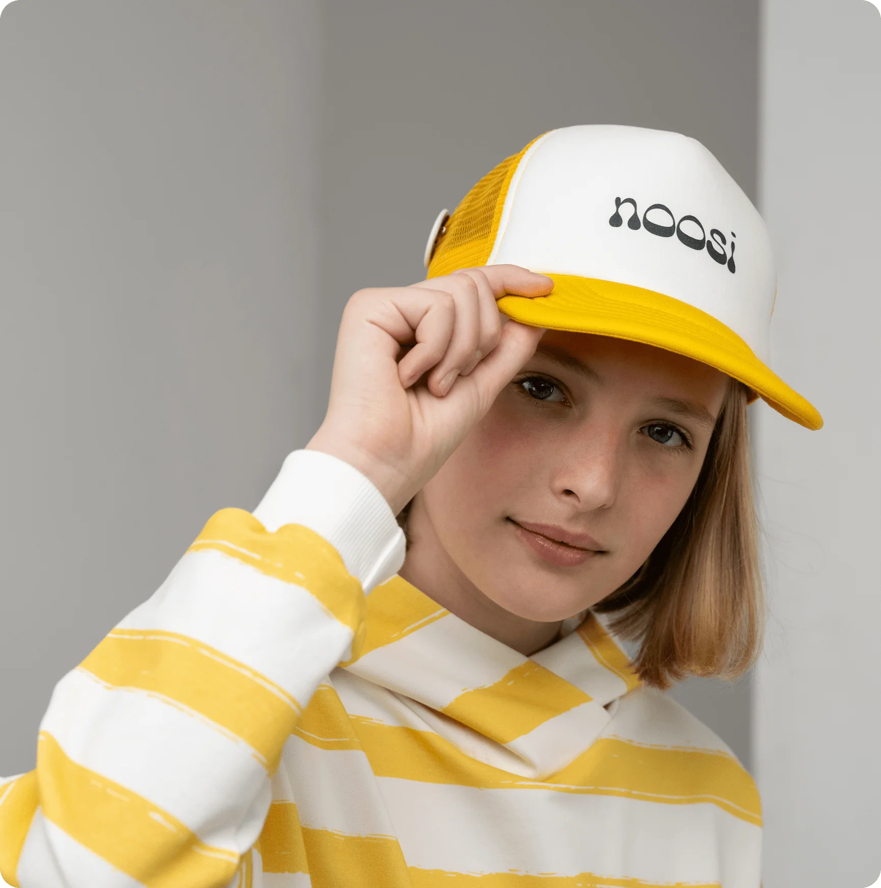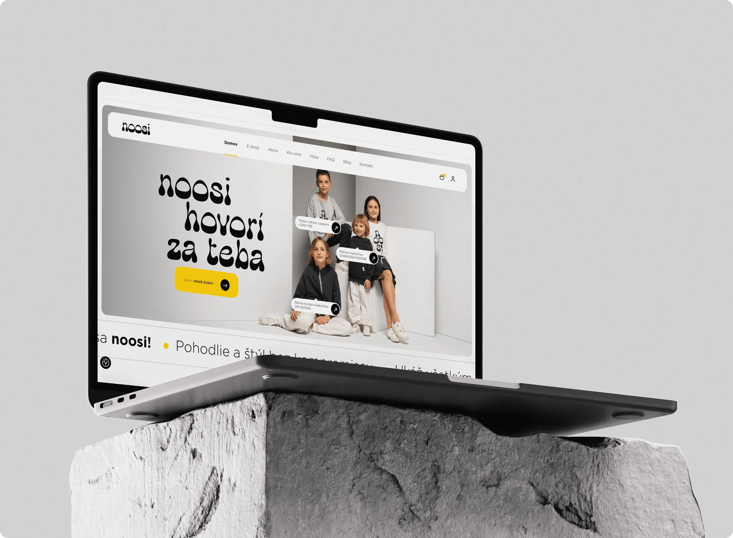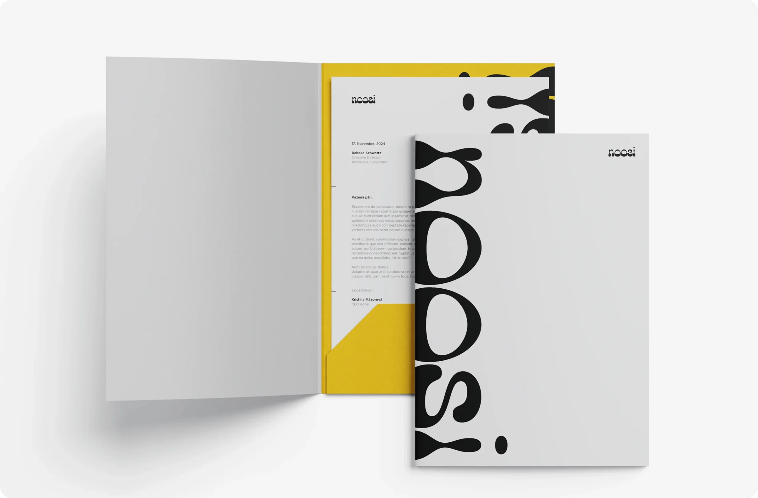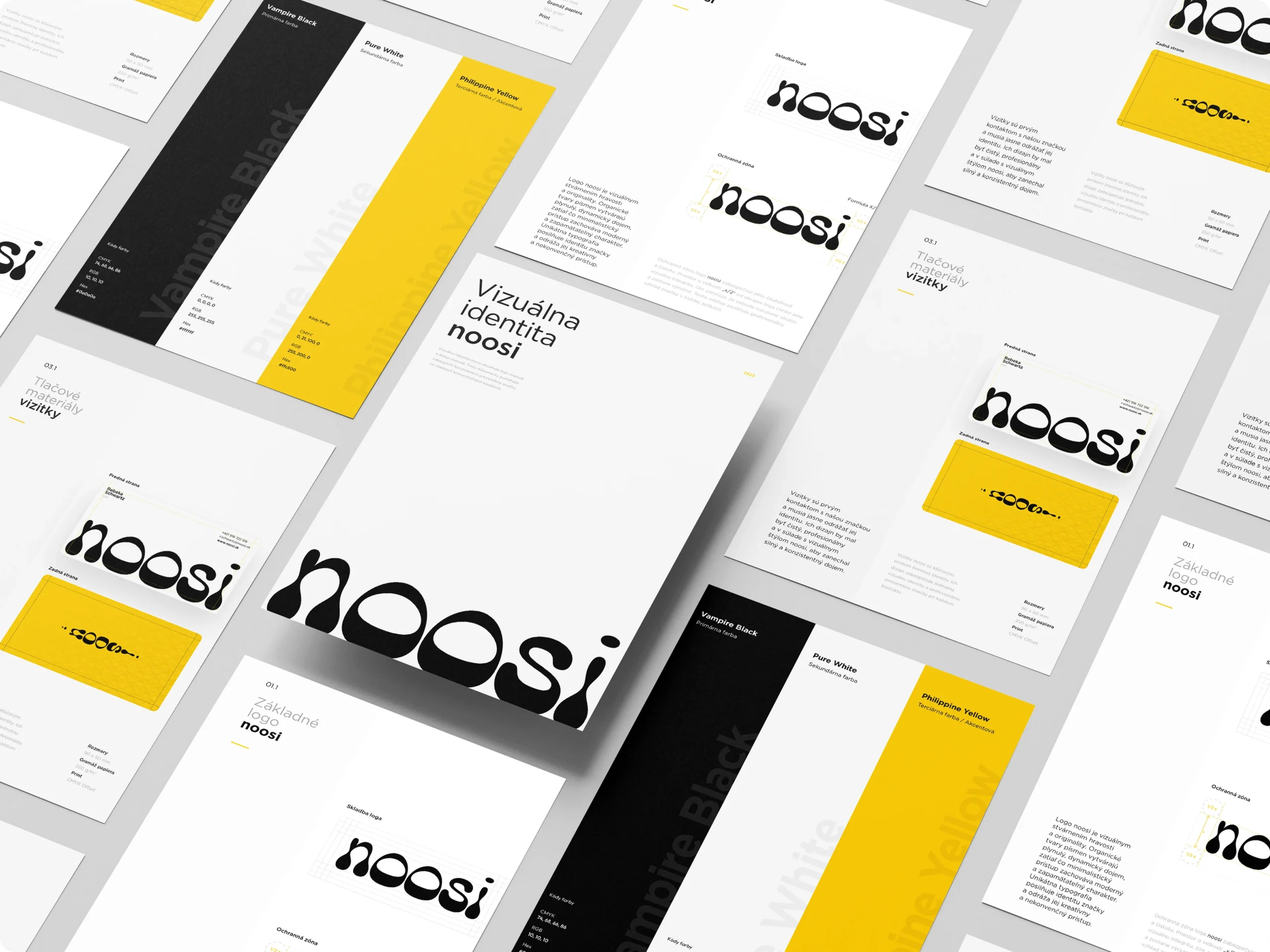 Organické tvary loga, výrazná barevná paleta a vlastní ikonografie odrážejí lehkost a originalitu značky. Výsledkem je identita, která je moderní, zapamatovatelná a připravená růst napříč všemi kanály. noosi Pojmenování, logo, vizuální identita, logo manuál, typografie, systém barev, tiskové materiály, digitální kampaně, produktové fotografie Výzva Vytvořit značku, která bude moderní, autentická a snadno rozpoznatelná. Noosi je nová módní značka, která přináší nový pohled na dětskou módu. Cílem bylo navrhnout identitu, která dokáže skloubit hravost s profesionalitou a vytvořit konzistentní systém, který lze použít na výrobcích, v online kampaních i v tisku. ⸻ Naše řešení Komplexní identita od názvu po designový manuál. Začali jsme s pojmenováním, které odráží hravý a originální charakter značky. Logo je postaveno na organických tvarech písmen a minimalistickém přístupu, který zachovává moderní a zapamatovatelný vzhled. Barevná paleta v kontrastní žluté, černé, bílé a šedé barvě přináší energii, dynamiku a vysokou rozpoznatelnost. Primární typografie Gotham zajišťuje čitelnost a jednotu, zatímco doplňkové písmo Discota dodává identitě zábavný a uvolněný nádech. ⸻ Vizuální identita Pravidla pro logo, typografii, barvy a aplikace. Součástí řešení byl podrobný manuál loga a design manuál, který definuje správné použití vizuálních prvků v tištěných i digitálních materiálech. Ikonografie s efektem "bubliny" vizuálně odpovídá logu a posiluje hravost identity. Vzor vycházející z tvarů loga umožňuje flexibilní použití v obalech, textilu nebo online grafice. Vytvořili jsme také vizitky, hlavičkový papír, obálky a pořadače, které tvoří základní vybavení značky. ⸻ Fotografování produktů Autentické a moderní vizuály pro prezentaci kolekce. Kromě designového manuálu jsme poskytli také produktové fotografie. Výsledné vizuály posílily charakter značky, vnesly do kampaní jednotný vzhled a umožnily společnosti Noosi prezentovat výrobky v profesionálním stylu. ⸻ Výsledek Jednotná a zapamatovatelná značka připravená k růstu. Společnost Noosi získala identitu, která je moderní, flexibilní a snadno použitelná v online i offline prostředí. Dnes značka působí profesionálně, autenticky a má pevné základy pro budování své pozice na slovenském módním trhu.